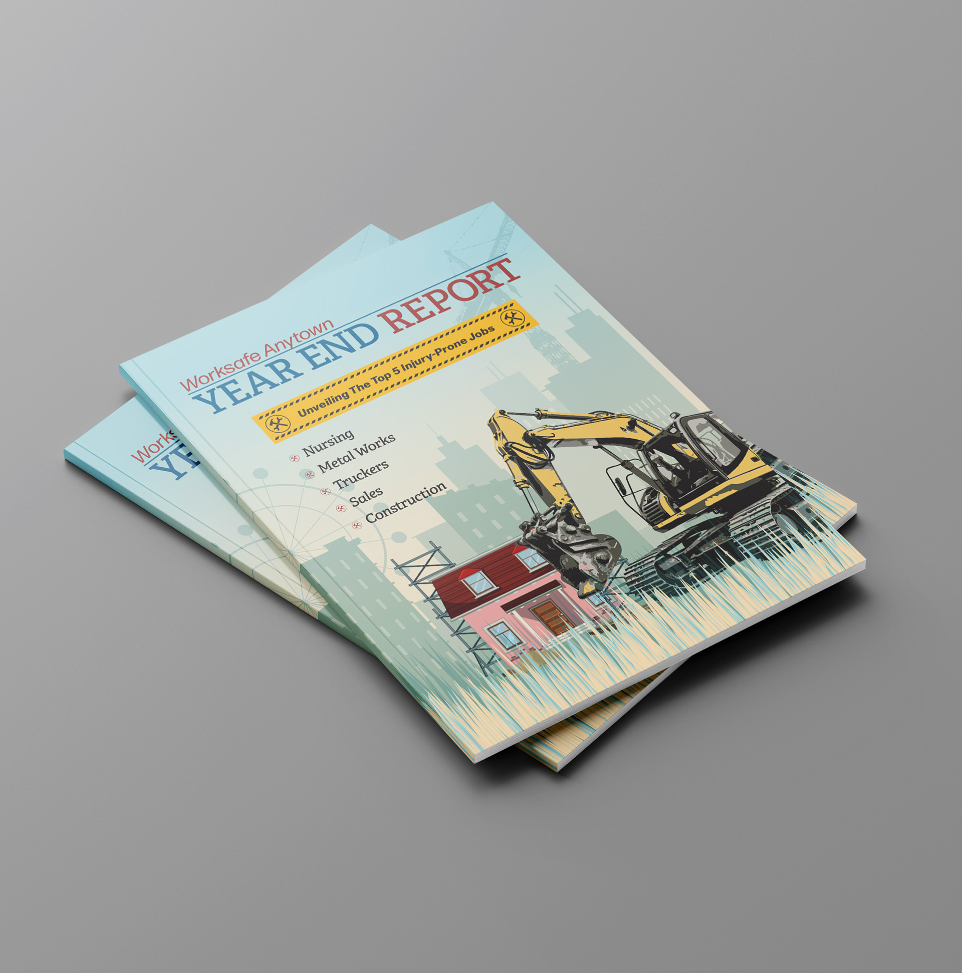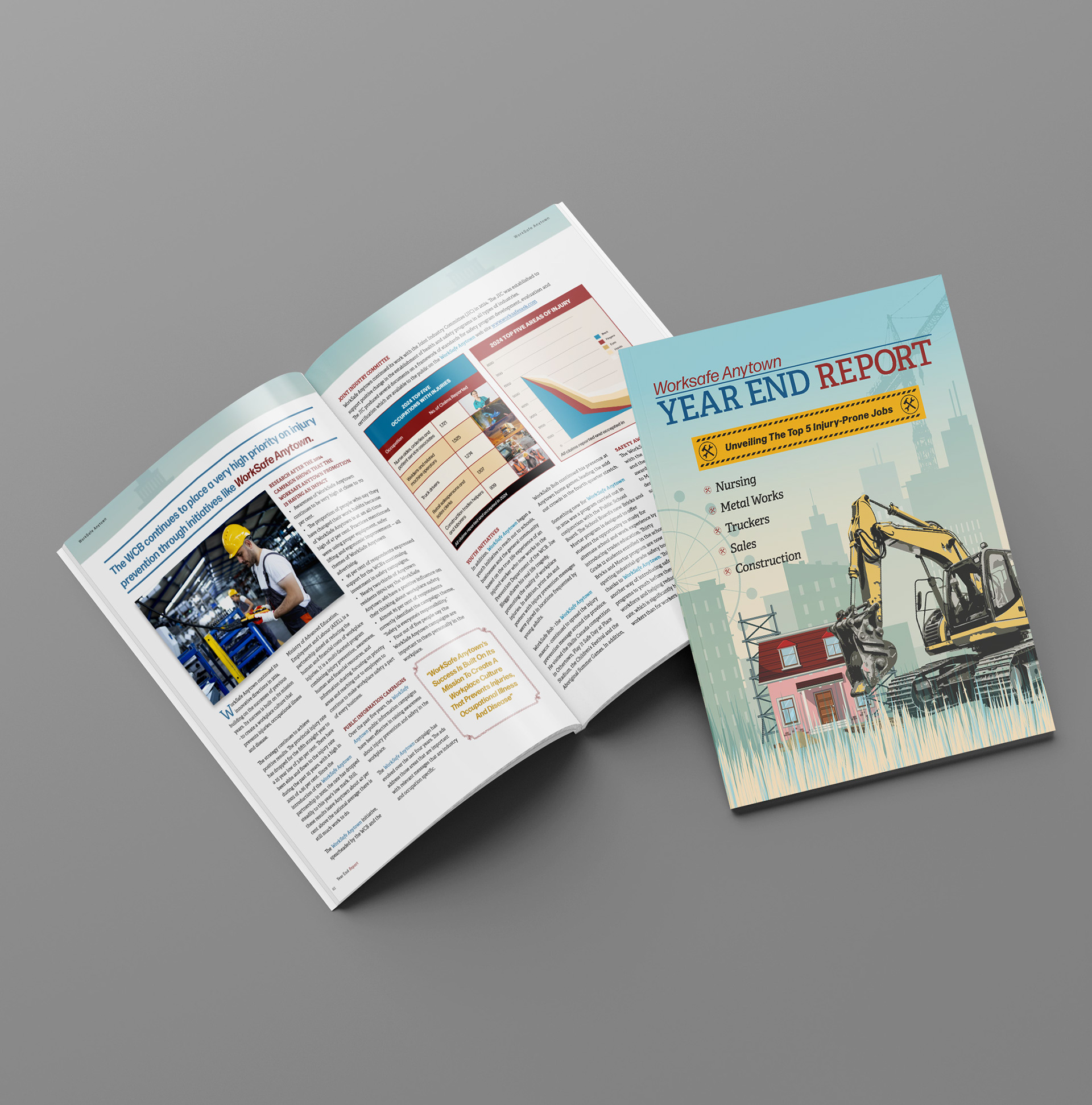 Worksafe Anytown Annual Report A booklet featuring brief articles on the 5 most injury-prone jobs, enhanced with mockups and custom illustrations.